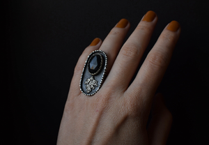 Each of these rings were handcrafted from sterling silver and feature rose cut Obsidians that have a brilliant, dark evergreen sheen in the light. These cuts of stone are Rainbow Obsidian, but only have a green sheen. They are magical in the light.