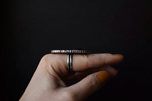 The pieces are finished with thick, double bands. The ring was given a dark patina before receiving a soft satin finish to allow the details to pop.