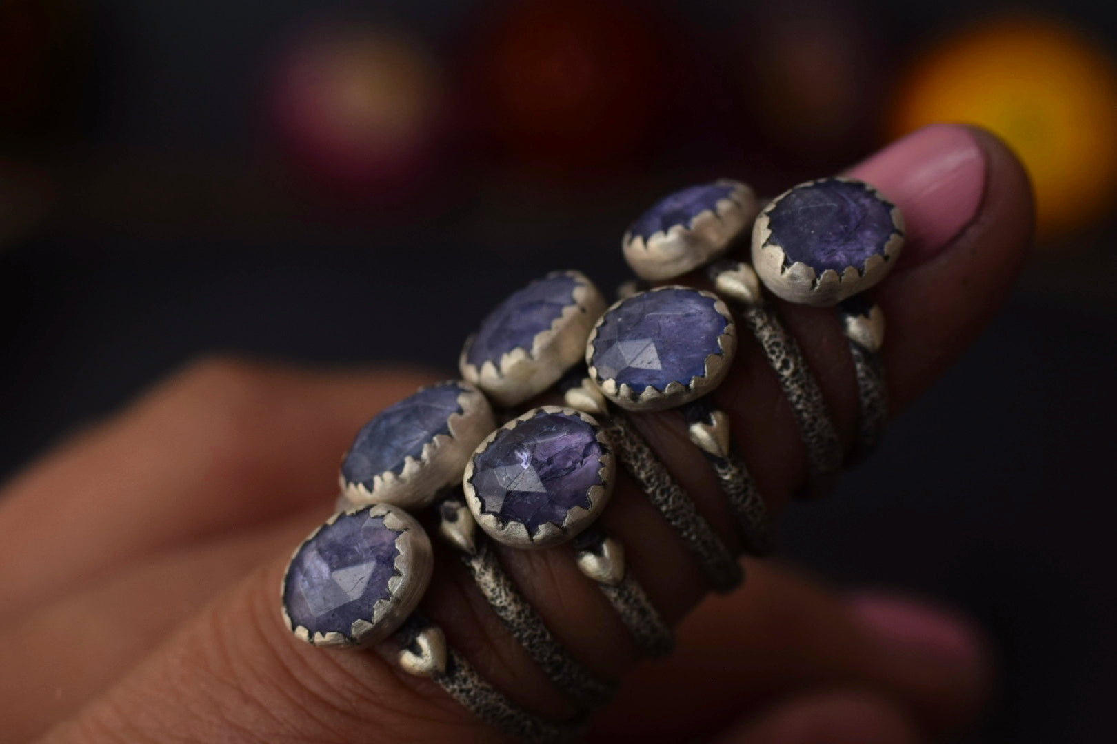 These adorable rings were created with the spirit of Valentines in mind. Each features a vibrant purple rosecut tanzanite. Tiny, puffed hearts were tediously handcarved from sterling silver. One of these hearts adorns each of the textured bands.